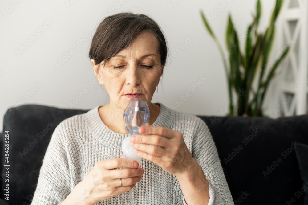 Side view a senior older woman is using inhaler for flu and cold treatment sitting on the sofa at home. Healthcare and medicine concept