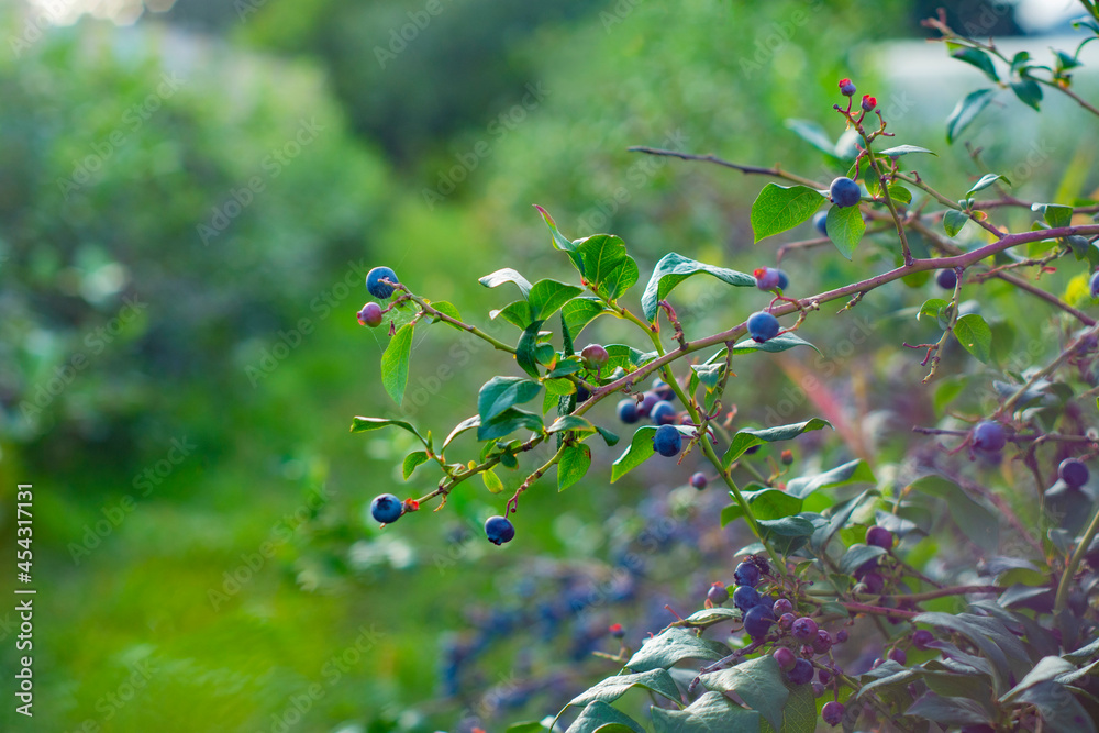 Fresh ripe blueberries on the growing bushes.