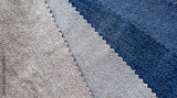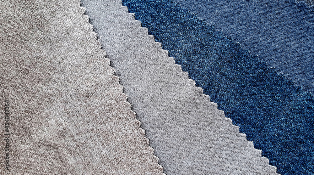 samples of fabric in light grey and blue color tone for interior upholstery or drapery works. swatch of soft fabric for selection.