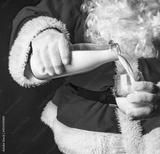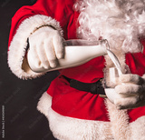 Christmas breakfast. Healthy food. Santa Claus in a traditional costume pours milk from a bottle into a glass.