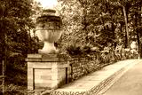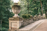 Old bridge with stone railings and flowerpots in summer park Alexandria. Peterhof, Russia.