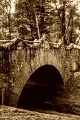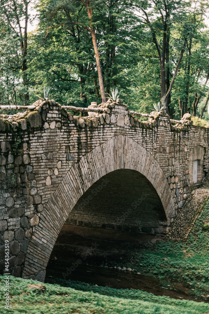 Beautiful old stone bridge in summer park Alexandria. Peterhof, Russia.