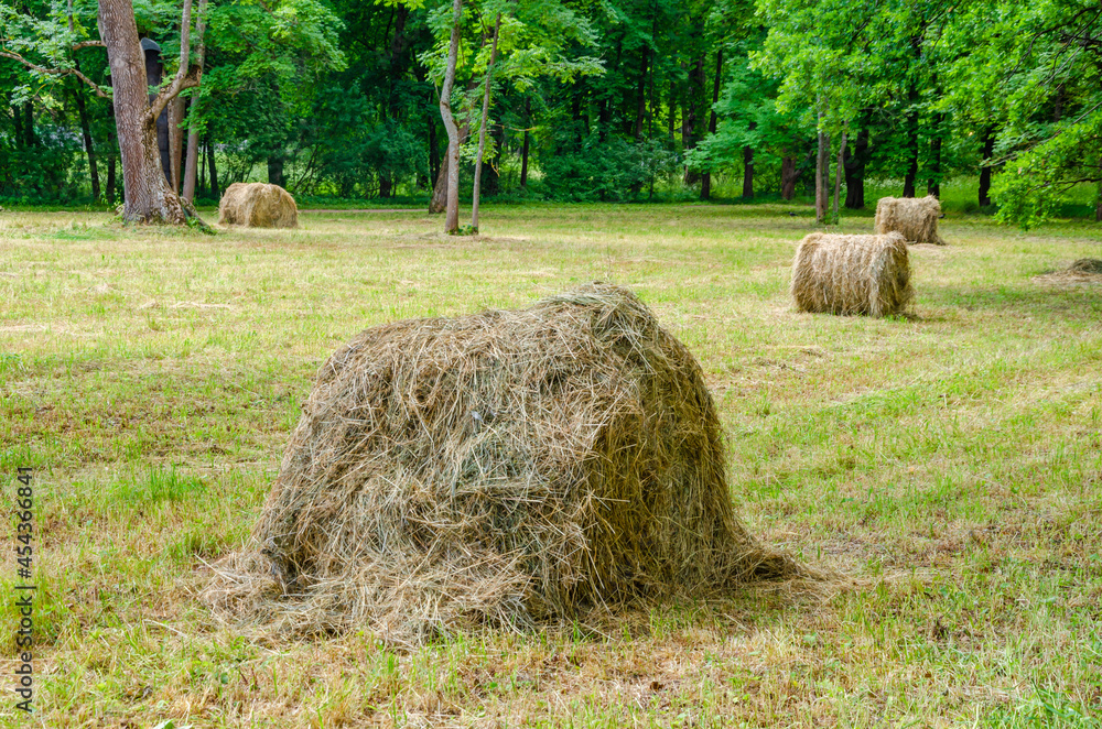 Hay in the form of rolls on the lawn in the middle of the forest.