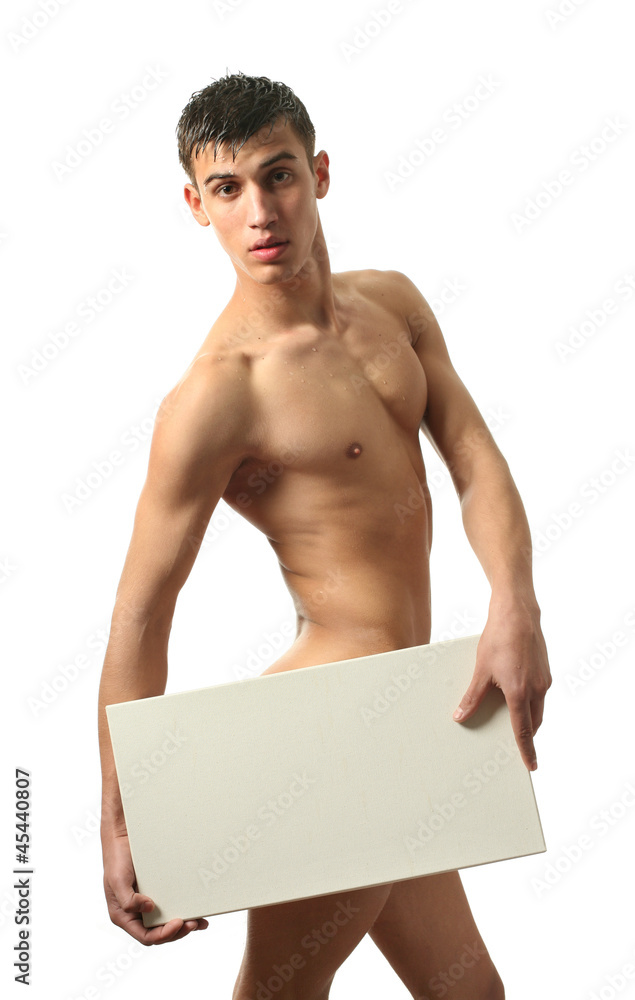 Naked Man Covering with a Blank Sign