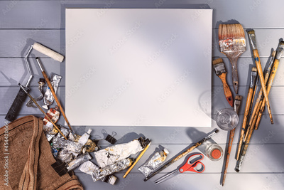 Drawing or painting in a moody art studio top view. Blank paper mock-up on gray wooden table or floor background. Flat lay creative concept image with drawing and painting accessories