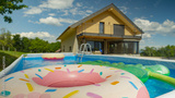 CLOSE UP: Colorful inflatable toys float around empty garden pool in backyard.