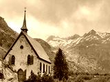 COPY SPACE: Stunning glaciers tower above a historic church in the Swiss Alps.
