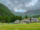 Scenic view of the rocky Swiss mountains surround the quiet village of Simplon.