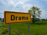 CLOSE UP: A yellow traffic sign indicates you are entering the town of Drama