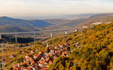 AERIAL: Flying over a small village and toward a highway bridge in Slovenia.
