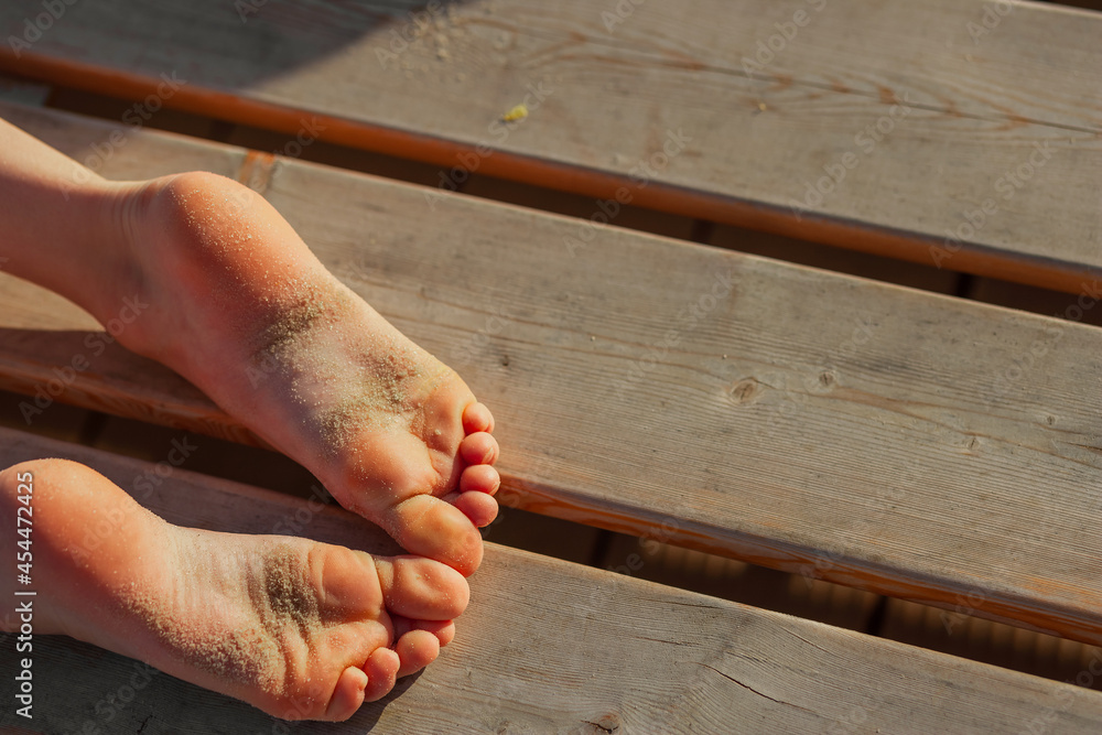 small bare feet of children with small bare toes, soiled with fine sea sand