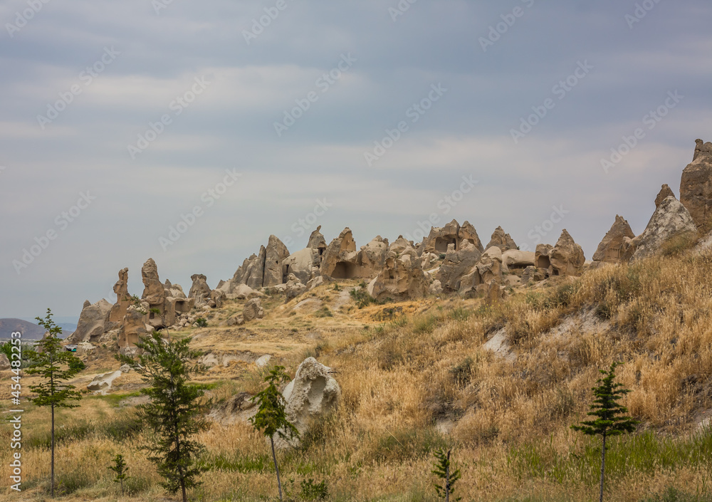 Amazing Volcanic rock formations known as Love Valley or Fairy Chimneys in Cappadocia, Turkey. Mushroom Valley one of attractions in Goreme National Park, Turkey. Mountains with rooms inside