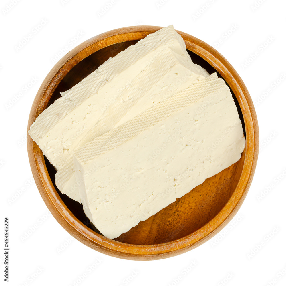 Slices of white tofu, in a wooden bowl. Sliced bean curd, coagulated soy milk, pressed into white blocks of different softness. Component of Asian cuisine, and a meat substitute. Close-up, from above.