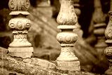a walk through a romantic garden with old traditional columns with a blurred background and focus on the column