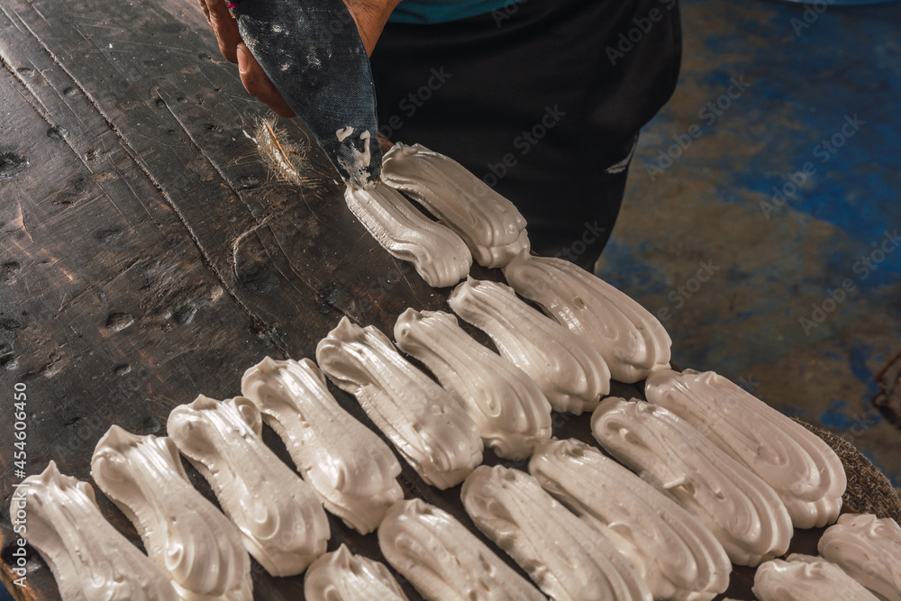 Artisanal process of making meringue, a traditional Mexican sweet, made from eggs, arina and sugar.