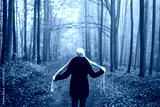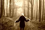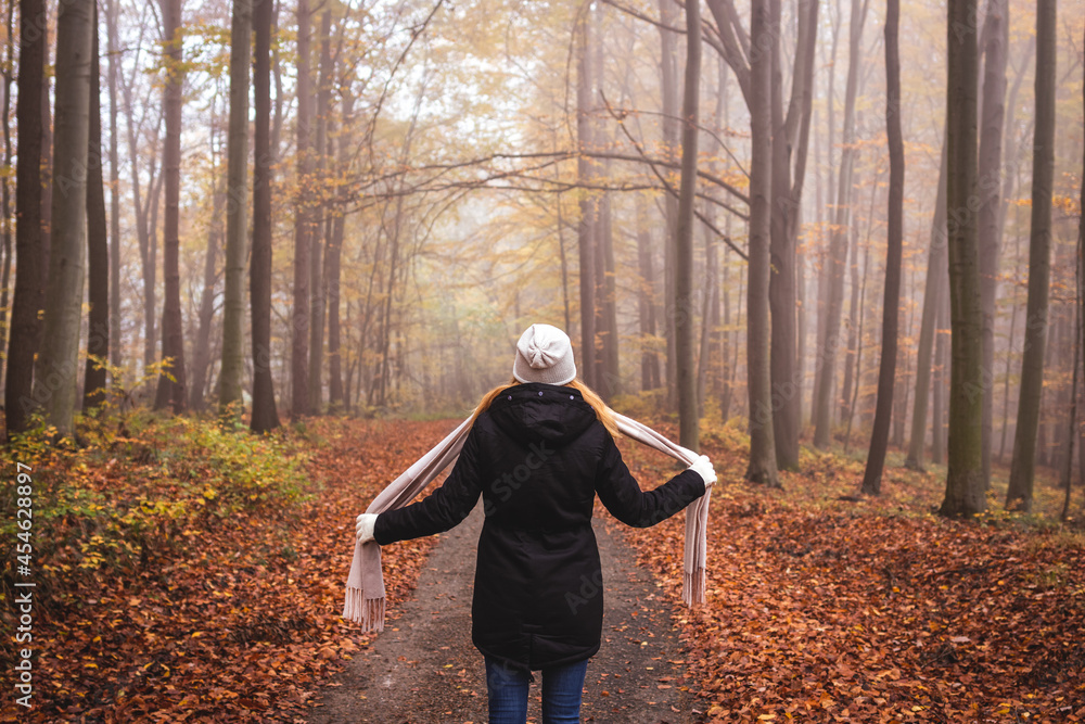 Woman ties woolen scarf during walk in autumn forest. Warm clothing in cold foggy morning