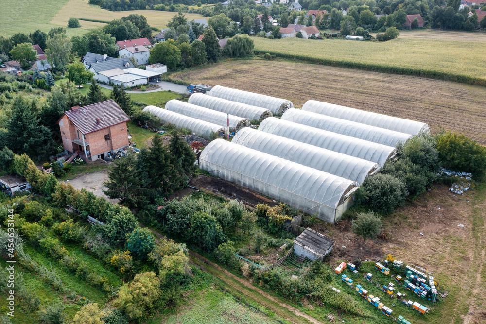 Greenhouses lined up in a row, covered with a transparent film of grown vegetables and fruits, top view. Agriculture, organic products. Drone