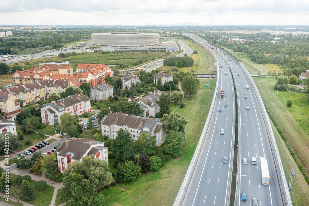 Aerial view of the freeway with various connections. Vehicles travel on the roads. Modern roads Poland