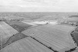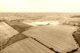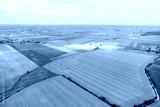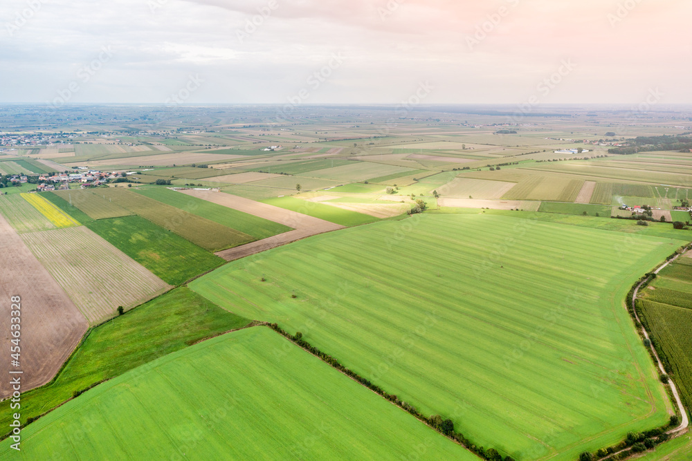 beautiful view from a great height on colorful fields, against the background of the summer blue sky, summer landscape with a drone, green field
