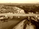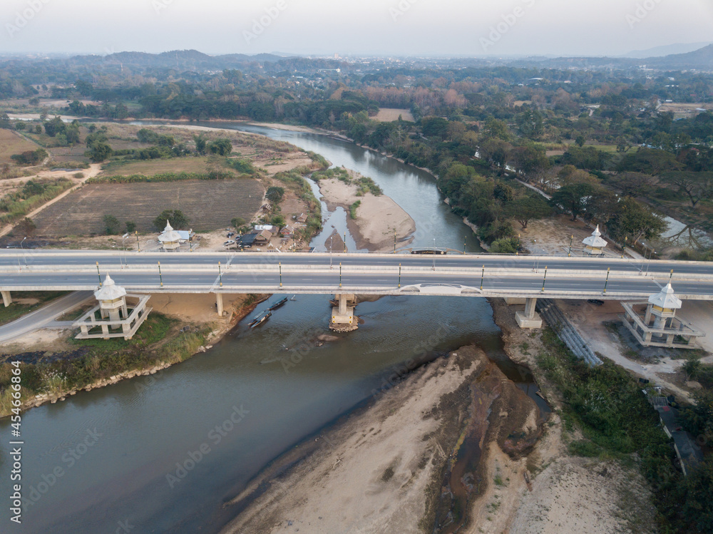 Aerial view of the bridge for crossing Kok river a river flowing out of the hills of Burma's Shan State winding its way across Chiang Rai province to Mekong river.