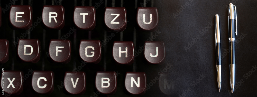 black luxury pen and button of type writer media business banner background