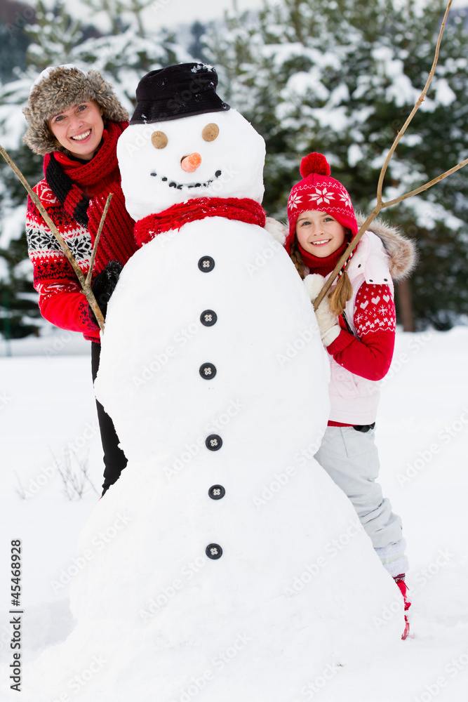 Winter fun, snowman and happy family