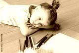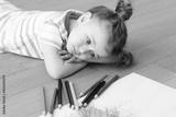 Sad tired frustrated bored stressful child lies on wooden floor with white sheet of paper and colored pencils. Learning difficulties, education concept. Family relationship. Misses home
