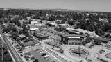 Daytime aerial view of historic downtown Folsom, California, USA.