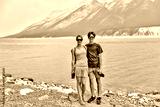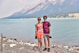 Young mother and teenager son hiking along the shores of Abraham Lake in the Canadian Rocky Mountains