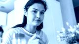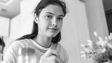 schoolgirl with smiling eyes sits at kitchen table closeup