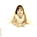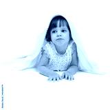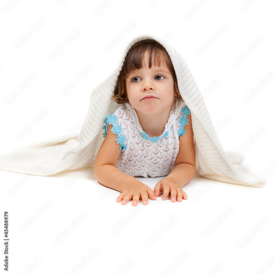 Thoughtful little girl lying on the floor wrapped in a light bla