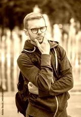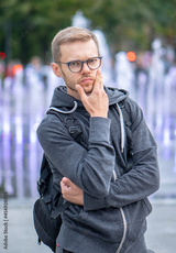 Portrait of a thoughtful man in glasses 25-30 years old with a backpack on his shoulder against a blurry background of city fountains. Concept: tourism and travel, change of residence.