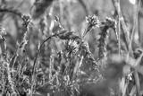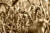 Blue cornflowers grow in a wheat field against a blue sky, close-up, selective focus.