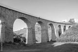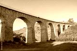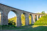 Viaduct in the mountains. Stone railway bridge between the hills on the background of nature, evening lighting.