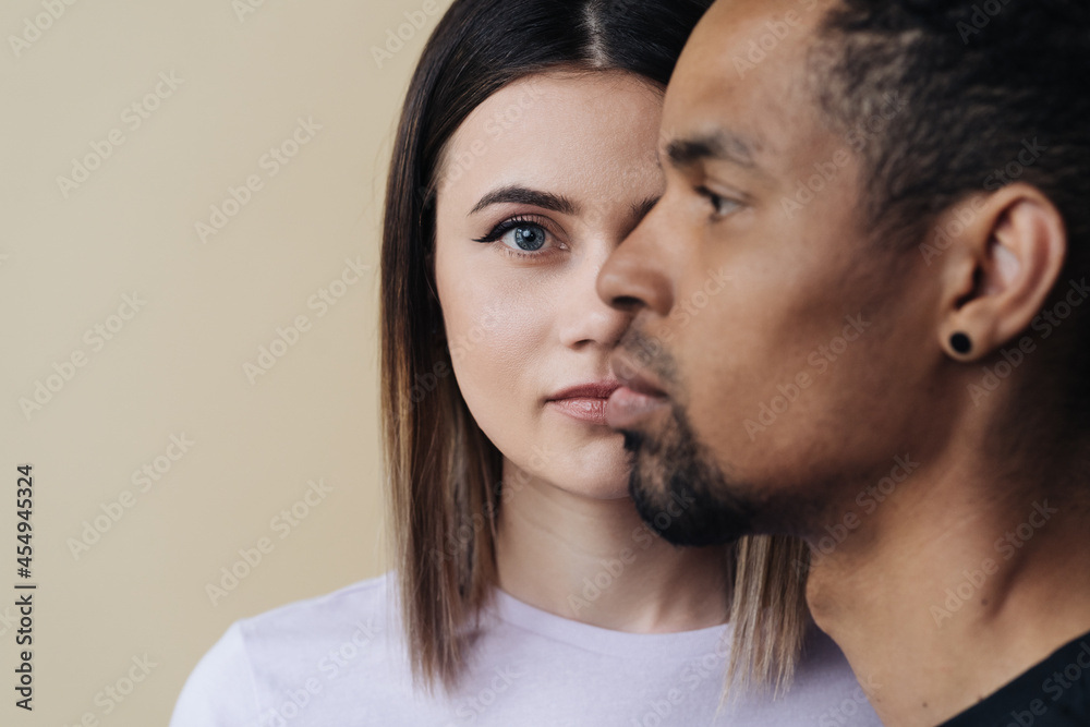 Creative Portrait of happy multiracial couple posing together over beige background with copy space in studio