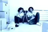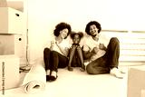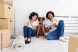 Young Happy African-American Family Unpacking after Move. Sitting on a Floor Resting at Their New Home.