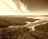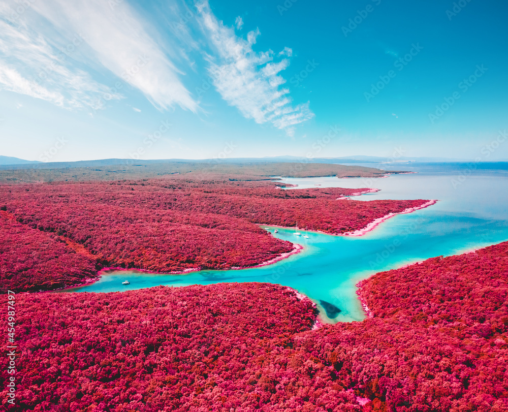 Tranquil color infrared lagoon on sunny day. Image of exotic landscape.