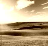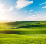 Morning sunlight on the wavy fields and cultivated land of agricultural area.