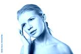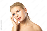 Woman applying moisturizer cream on face isolated