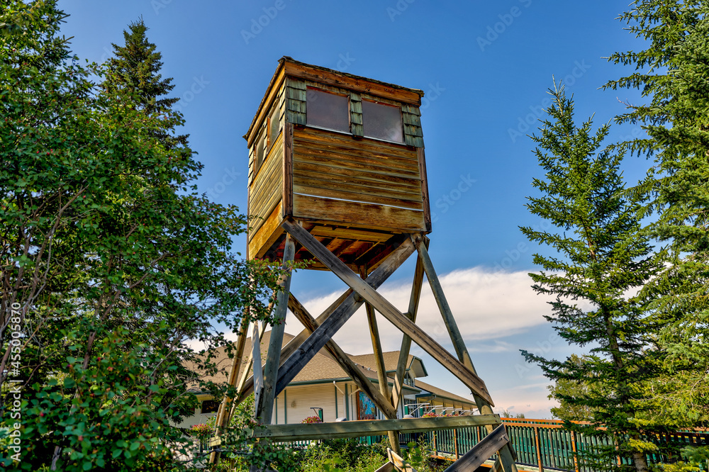 Signage and observation towers at the Rocky Mountain House Museum in Alberta