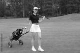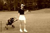 Woman in stylish summer golf outfit walking with bag of drivers on beautiful green course for golf game.