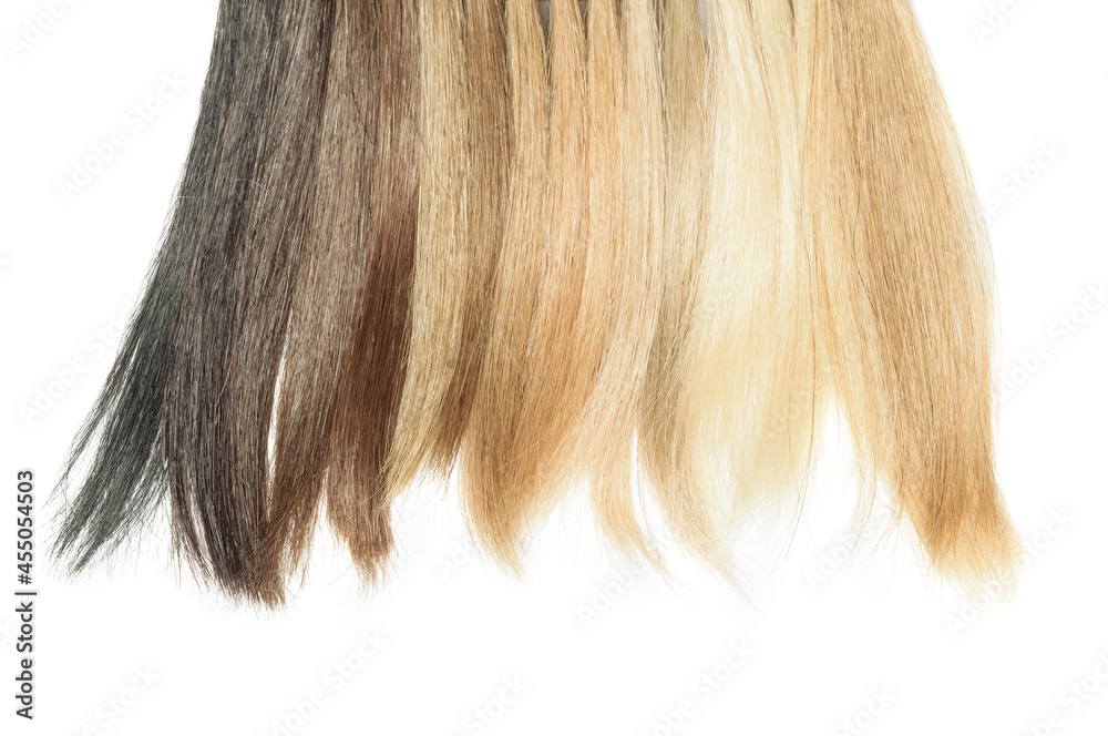 closeup of hair base color palette, hair samples chart, make of human hair, with wooden hair brush.