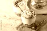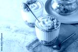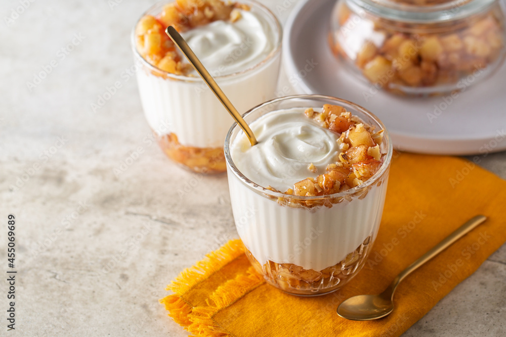 Greek yogurt with caramelized cinnamon apple and walnuts, dessert on a light stone table. Close-up.