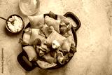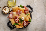 Italian appetizer. Fried bread crescentine or gnocco fritto with mortadella and soft cheese, decorated with basil leaves. Light stone background.