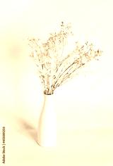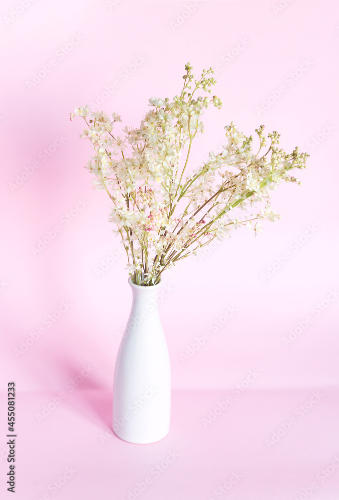 Bouquet of meadowsweet (Latin Filipndula) in a vase on a pink background.