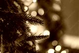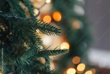 Christmas background, green pine branches festive background. Creative composition with border and copy space. New year decoration with bokeh lights from light bulbs