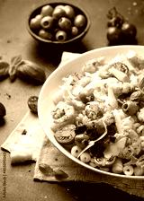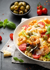 King prawn pasta salad with marinated green olives, cherry tomatoes and parmesan cheese shavings. Healthy food.