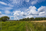 Beautiful summer nature landscape view. Lake coast on blue sky with white clouds background. Sweden.
