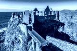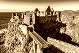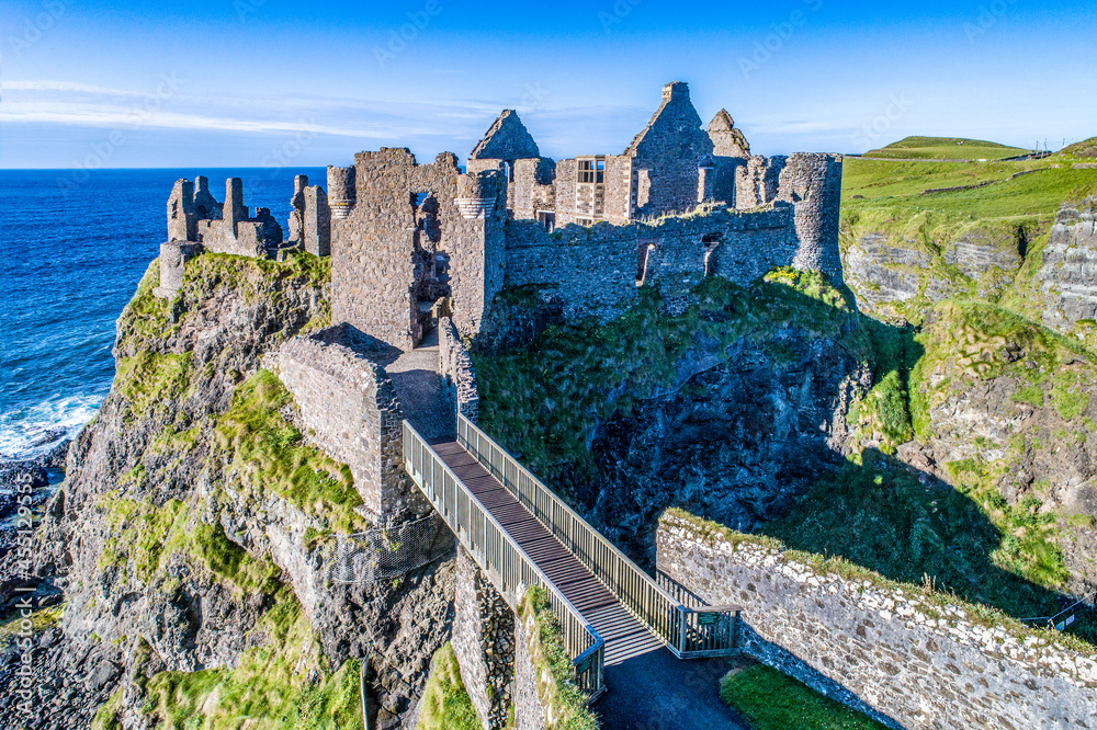 Ruins of medieval Dunluce Castle on a steep cliff. Northern coast of County Antrim, Northern Ireland, UK. Aerial view at sunset light.