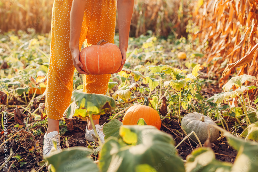 Pumpkins.Woman farmer picking autumn crop of pumpkins on farm. Agriculture. Thanksgiving and Halloween
